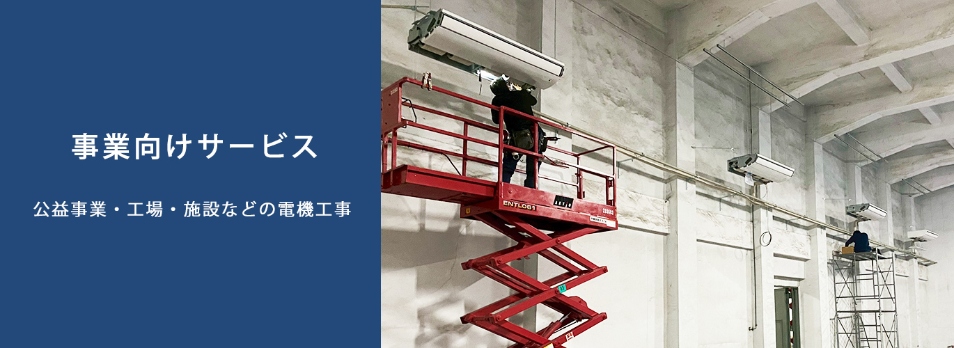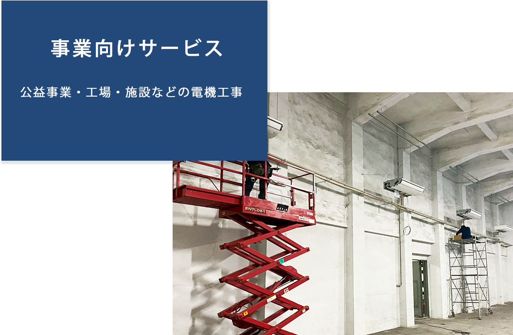 トータル電機サービスは大型施設から住宅まで幅広く電機工事をお受けいたします。安全スピーディな工事と自社所有の高所作業車で丁寧な作業を得意としています。